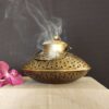 This decorative brass incense burner features a simple and elegant design. The burner has a small opening at the top for the incense stick and a wider base to catch ashes. Smoke gently flows from the opening, creating a calming and fragrant atmosphere.