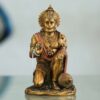 A small statue depicting the Hindu deity Hanuman, sitting in a devotional pose. The statue is made of copper and has a polished finish. Hanuman is a monkey god who is known for his strength, devotion, and intelligence. He is a popular figure in Hinduism and is often worshipped for his ability to protect from evil and bring good luck.