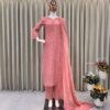Women’s Chinon Silk with Cotton Thread Embroidery Straight Kurti With Pant and Dupatta set
